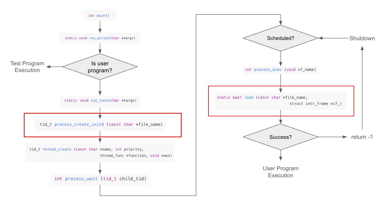 - PintOS에선 process_exec함수내의 load() 함수에서 해당 기능들을 구현한다.