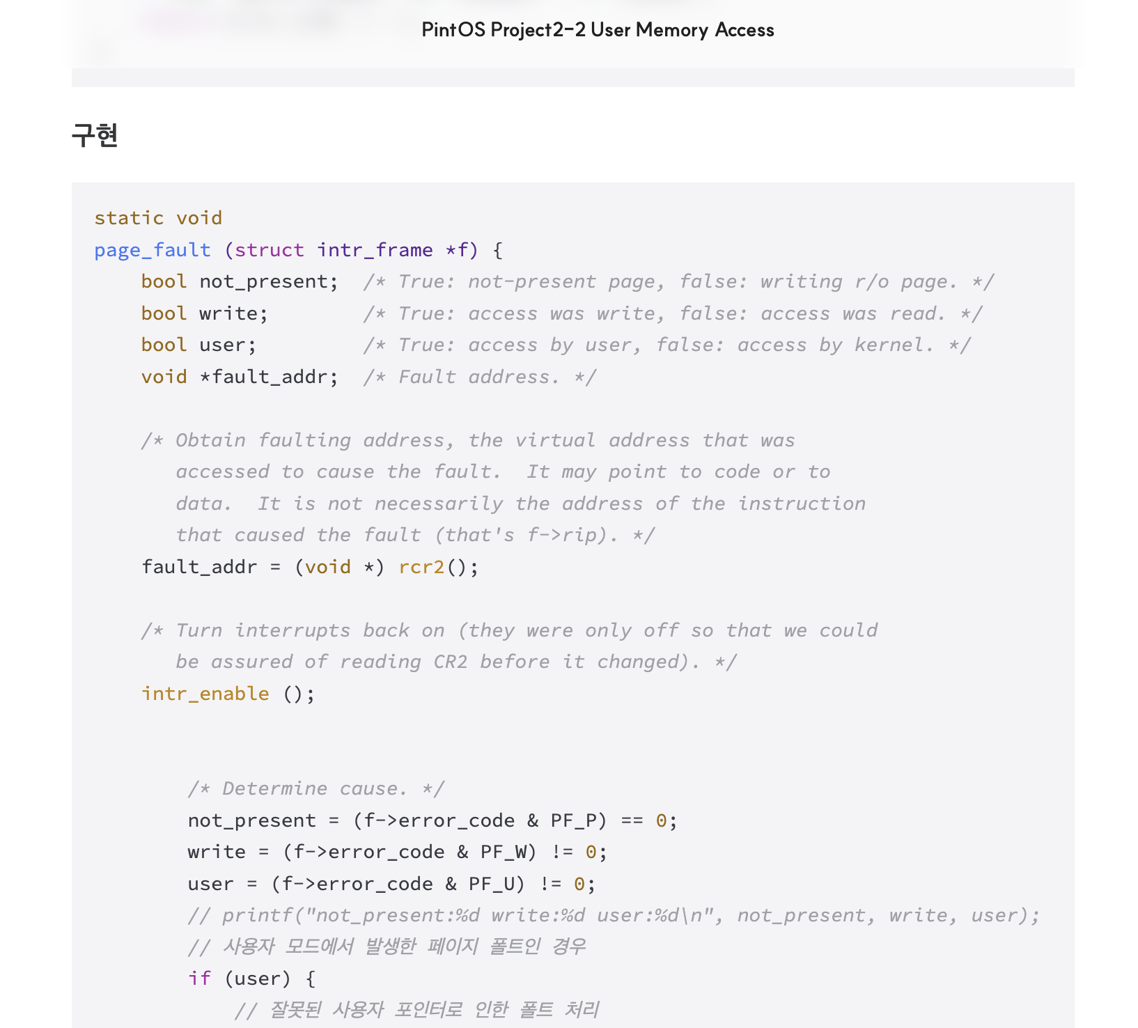 page_fault는 어떤 오류에 의해 발생한것인지 오류를 반환하지 않아 약간의 어셈블리 코드를 이용해 이를 사용할 수 있다.
